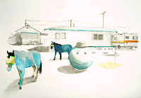 By choosing to work in the gap, rather than on either side of it, these artists explore and enlighten the tenuous space between transparency and mystery, humor and tragedy. Strewn throughout the gallery are broken narratives of longing, malaise, conflict, and lust. These snapshots of humanity offer little reference to prior events or to what may follow; there is no before and there is no after. The artists’ works are suspended in time, slipping through the gap, and creeping back onto the walls and through the windows of the known world. The viewer is pulled down the rabbit hole and into this nether world. Most effective at achieving this dreamlike, surreal quality are Lee, whose intense oil paintings capture the essence of space and emptiness, as if everyone has been raptured you the viewer is the only person left standing in this real yet unreal world. Ku’s elegantly wicked drawings are like sneaking a peek at a dirty picture in the library and realizing that the nude drawing is beautiful and suddenly not so dirty. Russo’s watercolors are uncomfortably non-utopian and too real to be surreal. Her paintings reflect the qualities of the times in which we live in a world where daily events can be cartoonish, appalling, sublime and entertainingly odd. If this was Conn’s idea of a wonderland, I’d like to visit again.
