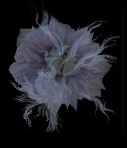 For Sabin Aell, everything that exists is based on a formula, an undefined code she used to create her mother and father series of images for “Moonwalk.” Based on a pair of echoing forms, these ethereal works are not twins, but opposites. All are 43″ x 33″ and placed in recycled wood frames. Each began with a photograph of plant life. The father series is a negative – a whitish image on a black background. The image is sealed and the artist then paints by hand thousands of short dashes across the image. She interprets the pattern from the background image as a code. That code reappears in the mother series, which begins as a photograph of a finished father piece. The artist then digitally removes the black and enhances the image, resulting in a lighter, grainier opposite. The title of the show seems disconnected, except for the artist’s statement hung on the wall: “Is the moon moving towards or away from us? Is beauty approaching us or are we stepping closer?” Aell says the mother series reflects our aspiration to find beauty and the father series the movement of beauty towards us. Perhaps this idea would seem clearer had the works been hung in pairs. Nevertheless beauty is evident. (Image: Sabin Aell, “Moonwalk 1| father series 1.1,” 2009, 48 1/2″ x 38 1/2,” mixed media photography, at Walker Fine Art.)