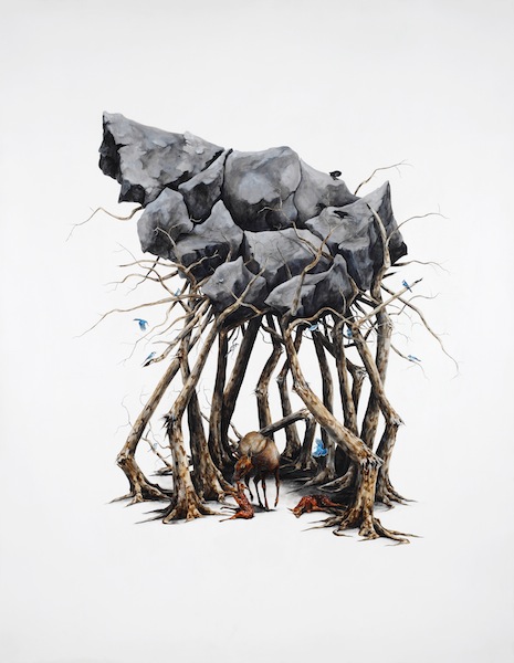 It would be easy to dismiss McLennanʼs paintings as dystopian and nihilistic. Desolate? Yes. But McLennan somehow manages to convey that our human attention to trying to know the unknowable is absurd and fruitless. Simplicity is expressed through the simple pallet of browns and natural tones of the paintings, and the subdued, even-keeled nature of the artist himself. In “Mercy,” blue jays (Cyanocitta cristata) fly around the scene, a slightly hopeful symbol, yet assertive against what appears to be a threat to them. A vocal and aggressive bird, one can