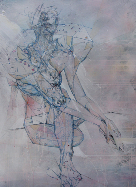 Whatever the motivation, the subtle shift is powerful. Thielkeʼs work continues to stand out among contemporary figurative artists as original. What is coming into focus for the artist is the importance of human touch to art-making. His works echo a bit the drawings of George Condo, particularly the Constructed Female Portrait, recently displayed at the Denver Art Museum in Face to Face. The architectural elements used to construct a drawing or a figure in Thielkeʼs hand seem less dark, less angry, less cartoon-like than Condoʼs Pollock-esque faces. The contrast of loose wash and tight lines, angles, shapes, and forms that make up his compositions allow the mystery and the power of the figure to stand on its own. The artist professes that his work is about “being in awe of what we take for granted in life.” This is evident in the complex forms and shapes that make up a shadow on a knee, while the curve of a back is hinted at by the loose stroke of a brush. Nothing in a Thielke work can be taken for granted.