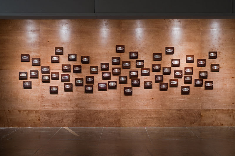 Dikeou’s installation features 56 color photographs of brass nameplates of jazz musicians that she took at a boutique hotel in Argentina, dedicated to telling a “history” of jazz. Mounted on wood panels, each 8”x10” photograph becomes part of a haphazardly hung row. The omissions struck her just as hard as who was included. To that end her exhibit includes a 17 by 12 foot photo-mural featuring the name Sonny Simmons.