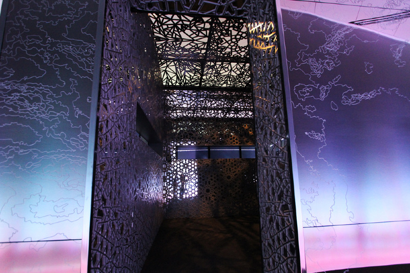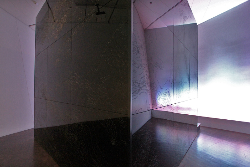 A relationship between transparency and veil interests the artist. “I love how you don’t get to see the full image of yourself,” Mehran says acknowledging that one’s reflection is divided by the arabesque pattern. She wants viewers to question the deep, ideological things that make us who we are. Not only individually, but to also consider that the patterns and the cube shape reflect thousands of years of culture refracting, changing and morphing. Mehran herself is Persian, the daughter of Iranian scientists , and has lived most of her life in the United States. She is a woman turning a representation of a sacred Islamist space into a reflective space for Western visitors. Her questions for the viewer is are you men of God or men of nature? Is it science or is it religion? Is it mathematical or is it spiritual? Nature is referenced on the external surface of the cube through the topographical map. The geography remains the same, but the countries change over time, borders shift and are merely drawn on a map. The interior of the cube could then represent God, with its arabesque patterns, though Mehran’s arabesque is intentionally imperfect, echoing the notion that only God is perfect. The Kaaba is a representation of heaven on earth and was built by Men of God—Abraham and Ismael.