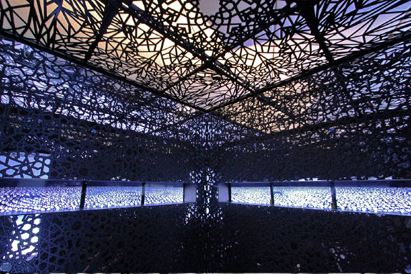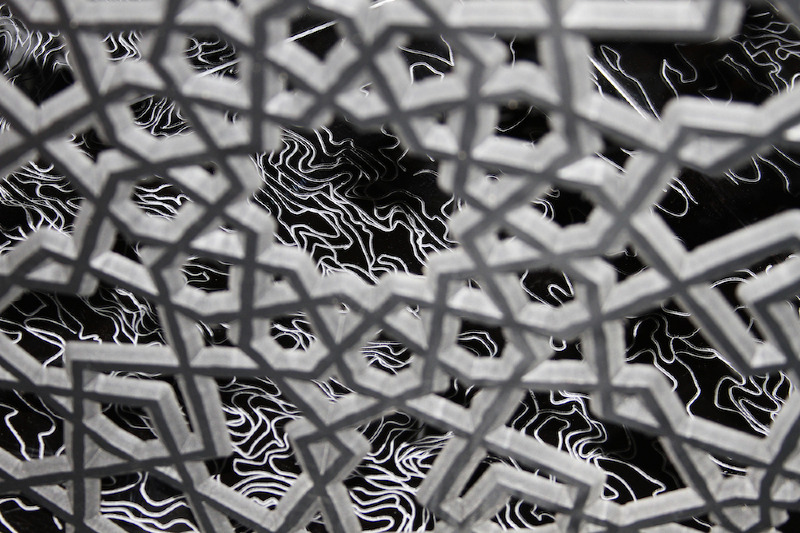 Inside the cube a self-referential component of elaborate calligraphic patterns cut with a Computer Numerical Control (CNC) machine veil partial images of the viewer reflected back at herself. (The pattern is cut into black acrylic, which is layered over mirrored acrylic.) Based on the Islamic arabesque, a geometric pattern that typically portrays repeating floral or vegetal designs often symbolic of the infinite nature of deity, Mehran’s arabesque begins with a pattern centered round a twelve-pointed star. The pattern mathematically disintegrates asymmetrically and the eye begins to wander until the viewer can no longer find the central star but begins to see other lines and shapes forming.