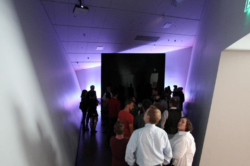 The Fuse Box Gallery on level four of the Denver Art Museum’s Hamilton Building is all angles with slanted walls and sloping ceiling, as designed by architect Daniel Libeskind. A walk-through installation conceived by artist Laleh Mehran interacts with Libeskind’s angles by placing a large, black, acrylic cube near the far end of the long, tilted space.