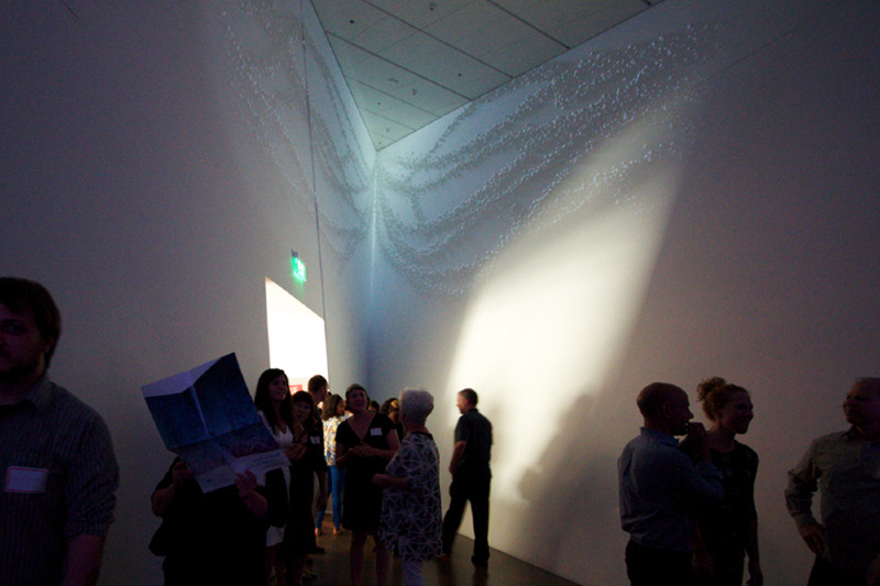 When the viewer steps up into the cube, nine computer monitors surround her. Computer-designed, organic pod-like shapes are triggered by the motion of human presence and appear to come toward the viewer within the monitors. The sensation is one of overwhelm, the elaborate patterns engulfing ambulating shapes, swarming sounds and shuffling movement.