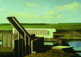 His landscapes explore places and structures that echo the haunted houses, squares, gardens and railway stations painted by de Chirico. But where de Chirico used the landscape as a backdrop for mysterious symbols and objects, Mühsam finds those symbols and objects in the land with the shadows and perspective just slightly off. Mühsam’s paintings of landscape models are the strongest representation of the metaphysical. They have a strange and unfamiliar context. Why a model of the destruction created by mining or the representation of a partially built structure?
