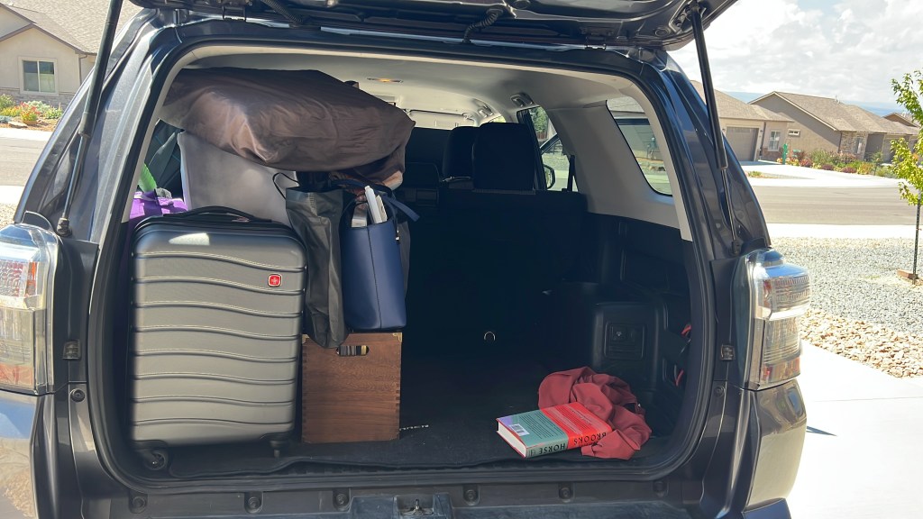 Saturday morning I got up and had the tires balanced and rotated on my Toyota. I washed the Toyota and vacuumed the interior in prepartion for the long road trip ahead. I indulged in breakfast tacos. (It’s Texas, ya’ll, and they are the best–barbacoa and bean, egg, bacon and cheese.) We went to my cousin Shea’s to watch the UT game. They beat Rice 37-10. Dawn played her final match in the tennis tournament that night at McFarlin. I used to play tennis and I’ve hit some balls on my own at the high school tennis courts in Montrose and in the raquetball court at the Rec Center, but I want to play tennis again, with a league. And that is not available in Western Colorado.